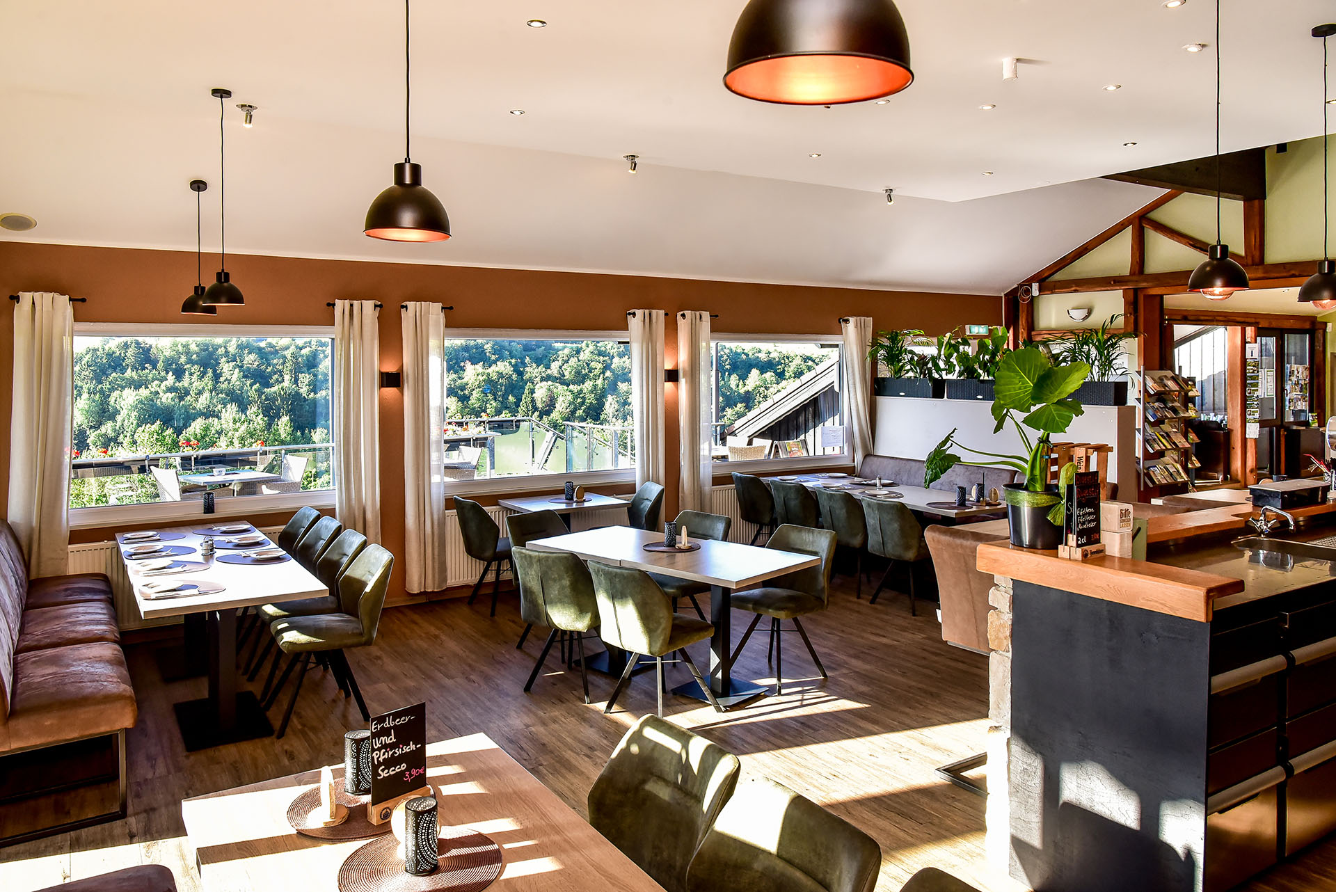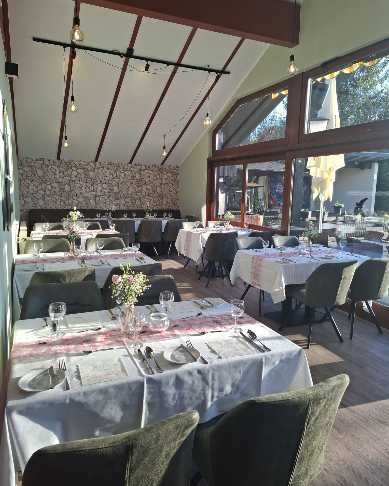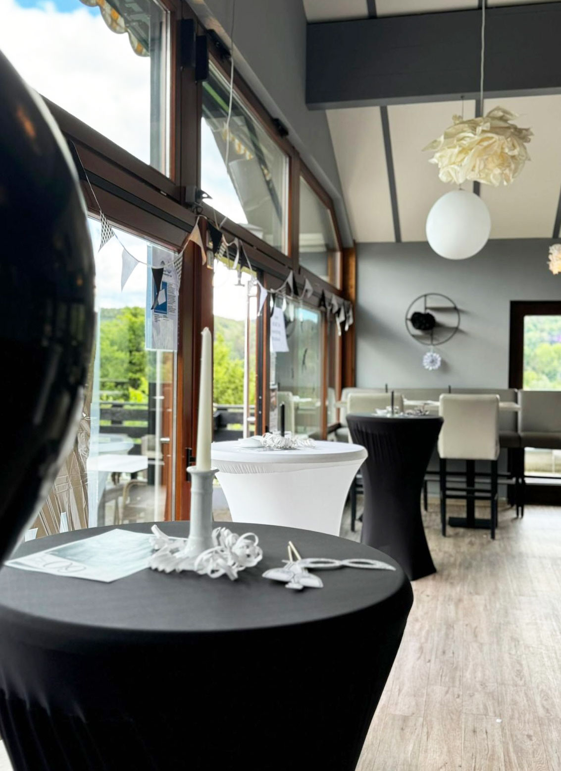 Unsere hellen, stilvoll eingerichteten Räume bieten den idealen Rahmen für unvergessliche Feste. Große Fenster mit weitem Blick ins Grüne schaffen eine gemütliche Atmosphäre, in der man gerne zusammenkommt – ob im kleinen Kreis oder mit vielen Gästen.